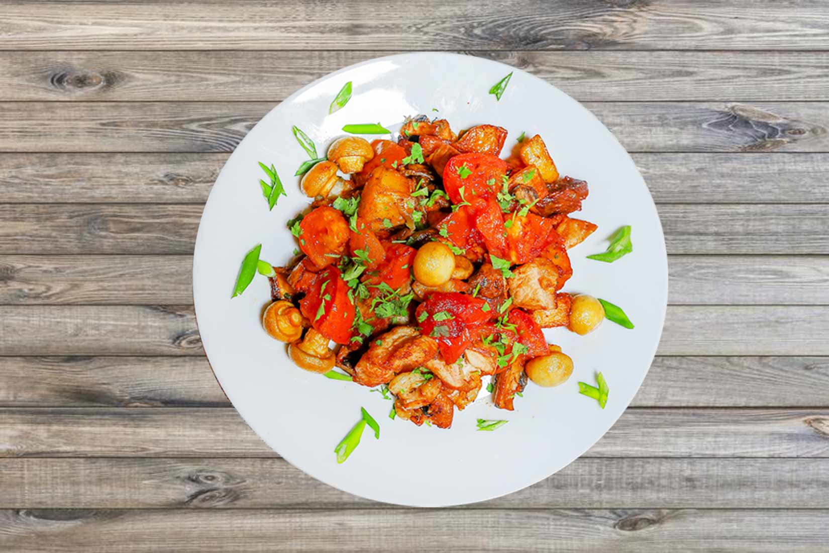 Խոզի միս, կարտոֆիլ, սունկ, բուլղարական պղպեղ, լոլիկ, սոխ